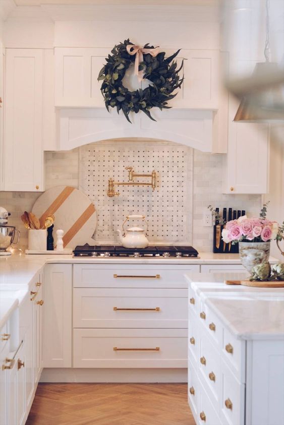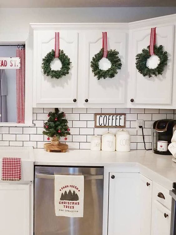 Or how about attaching wreaths to your cabinets? We love how they pop against the white!
