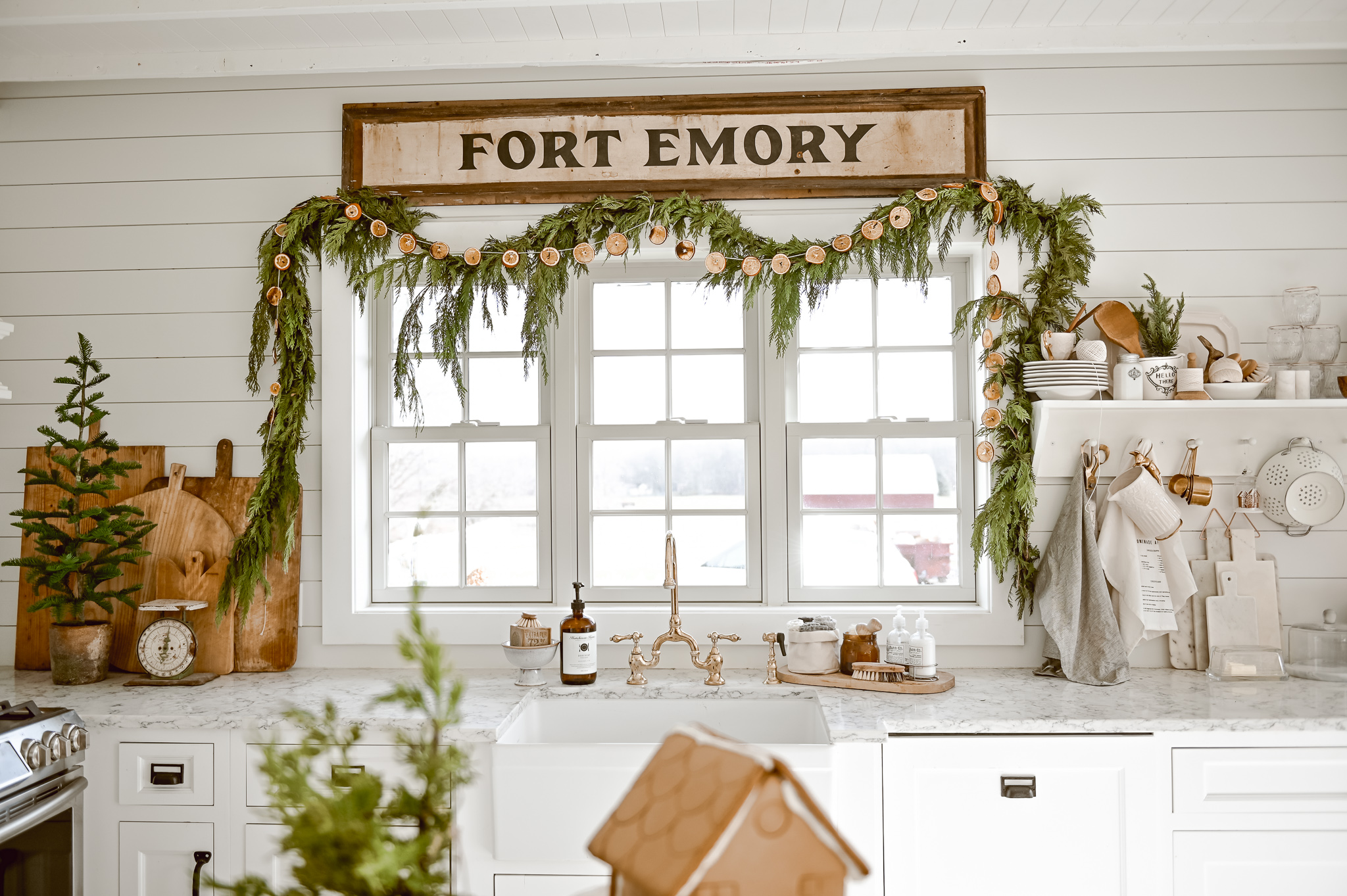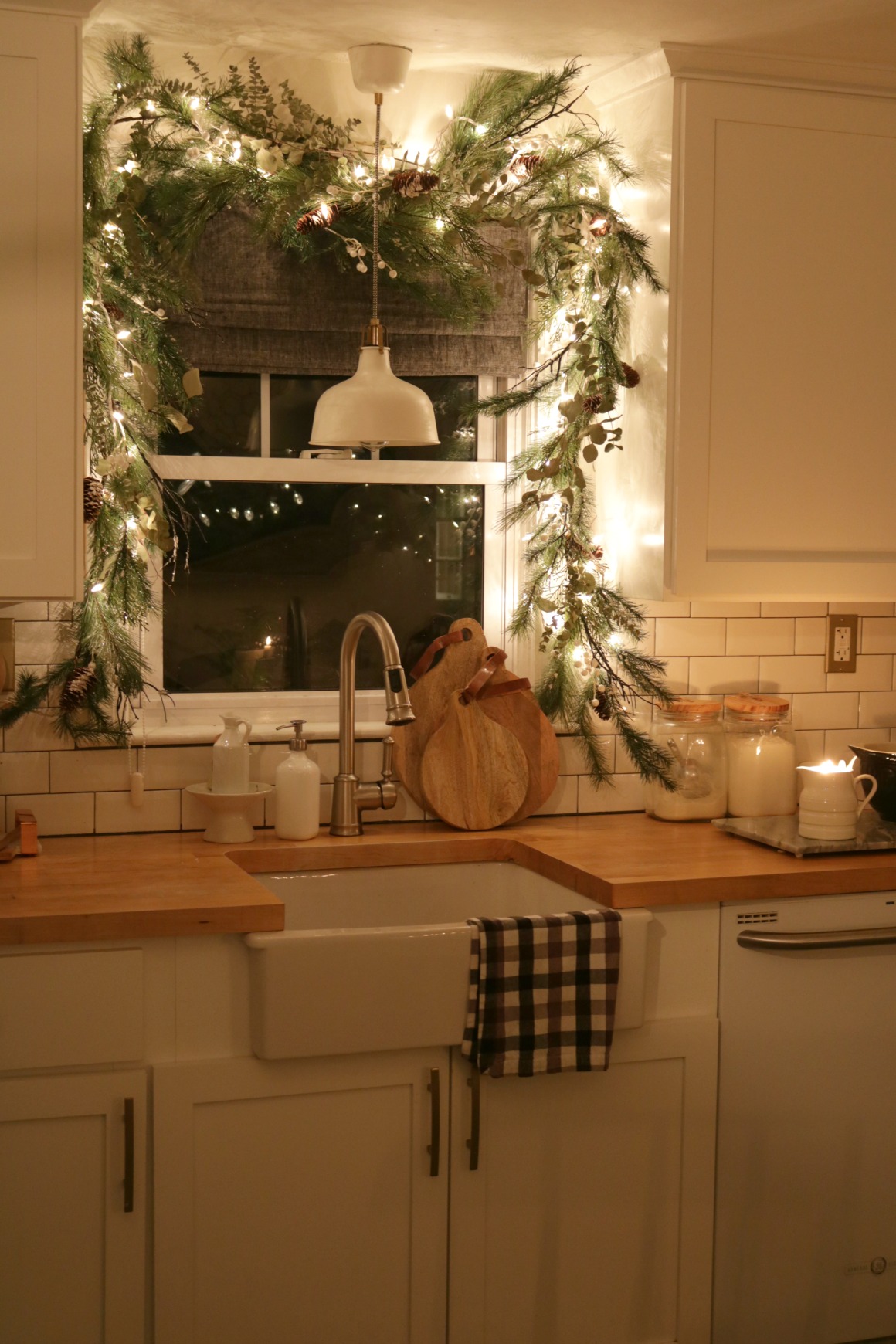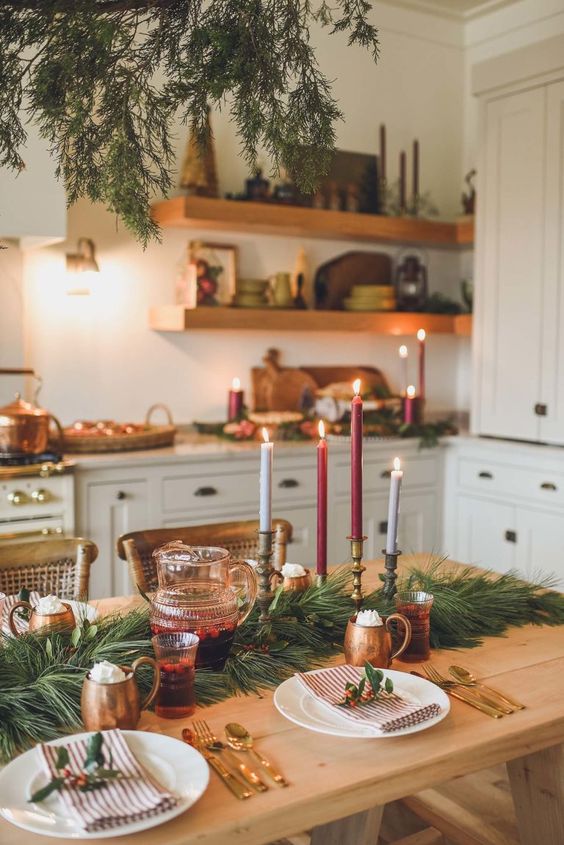 The key to a classic holiday look is to keep things simple and natural. We love this kitchen Christmas decor with simple garland used in the open shelving and around the doorways. Also, what a fun idea to use the garland for Christmas cards!